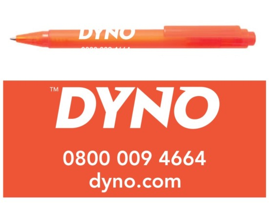 Printing: 1 colour print on the barrel in line with clip. Printed with the Dyno logo, 0800 009 4664 and Dyno website.